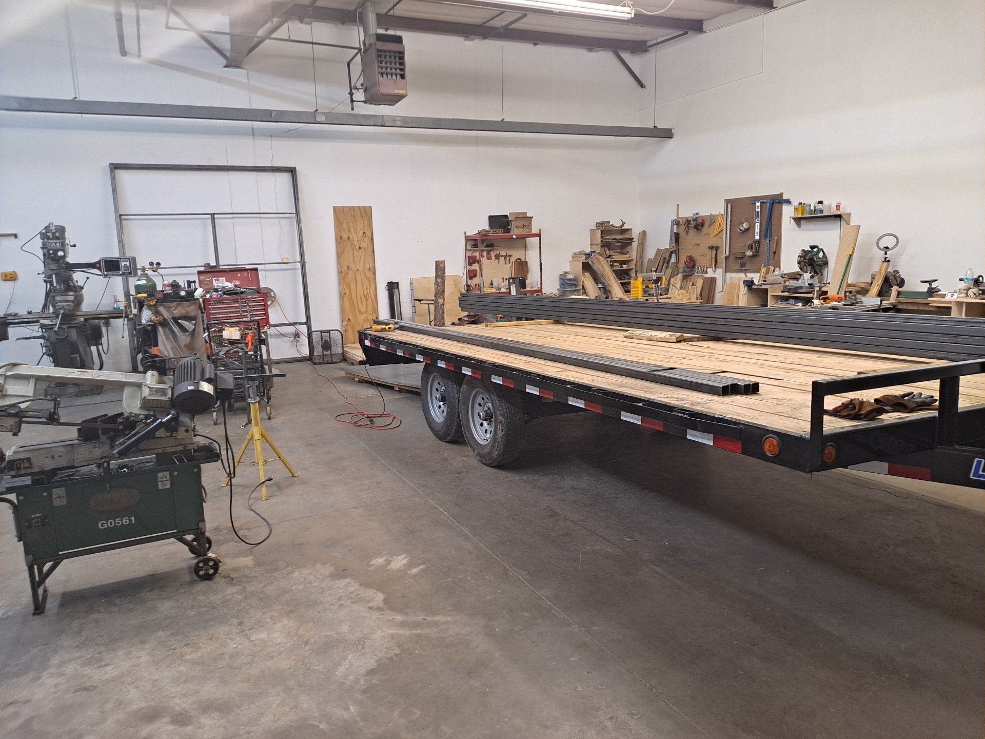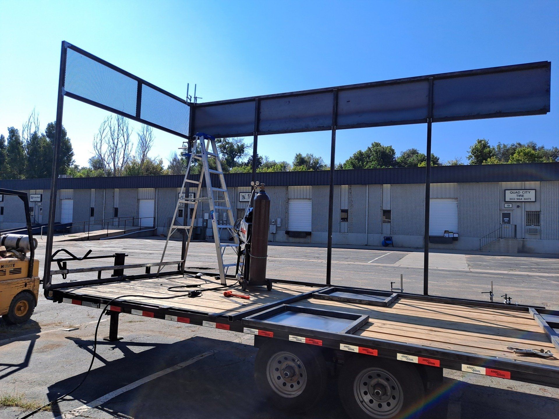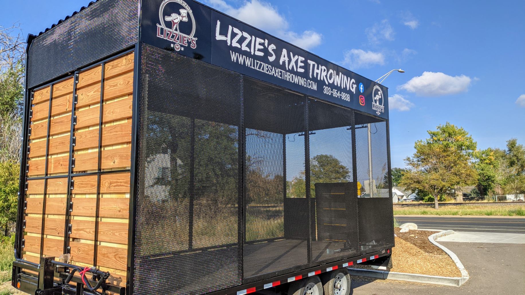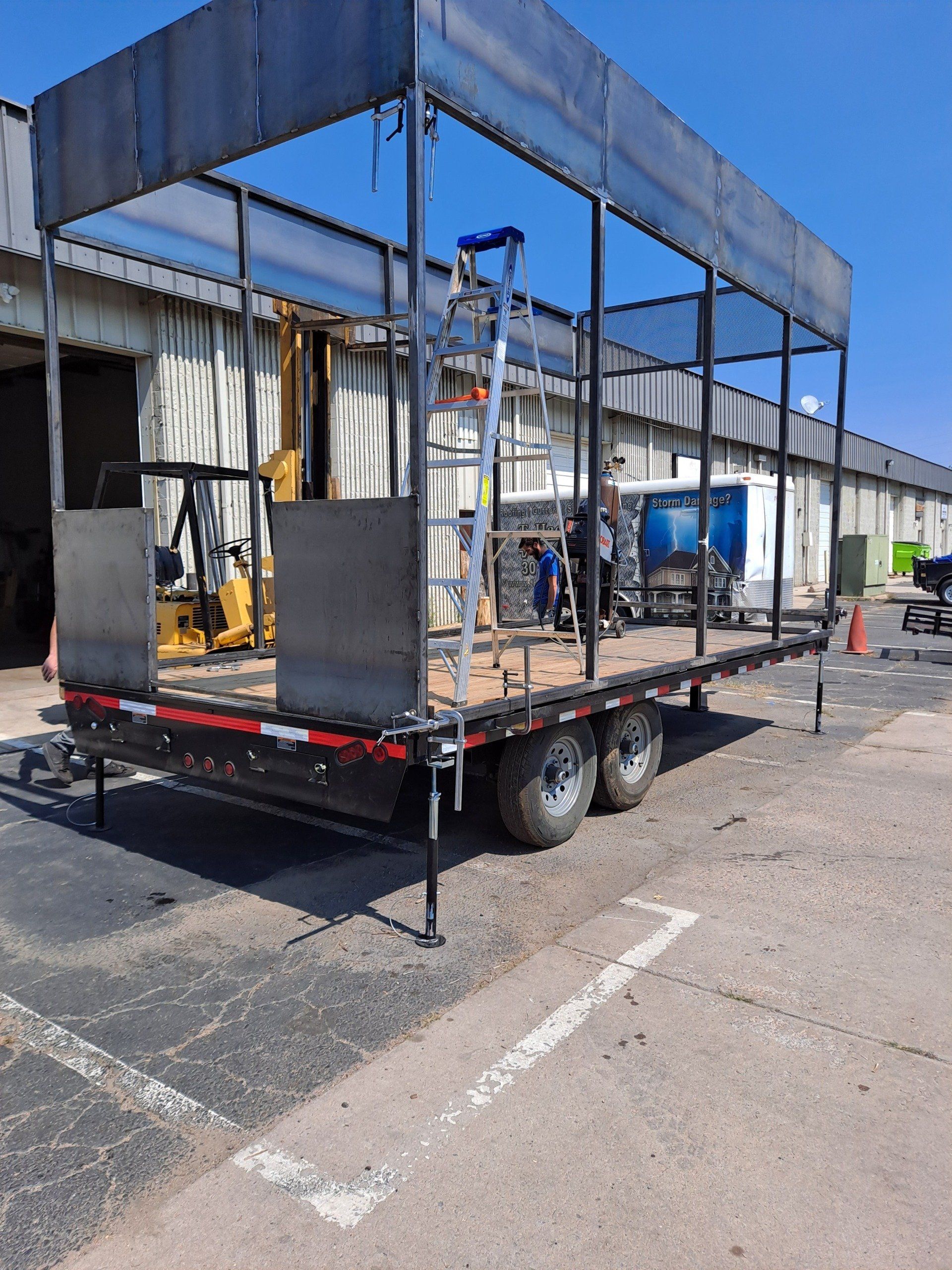 Lizzie's contacted us after having a bad experience with another company. They supplied the flatbed trailer and we supplied everything else. One by one we built each side, front, and back piece in the shop. Next, we used a forklift to raise each one onto the trailer and tack it securely in place. We added a handicap accessible ramp that folds away for traveling. The front consisted of two swinging doors for the targets to attach to. After two long, hot, months of outdoor building, it was sent off to be painted.